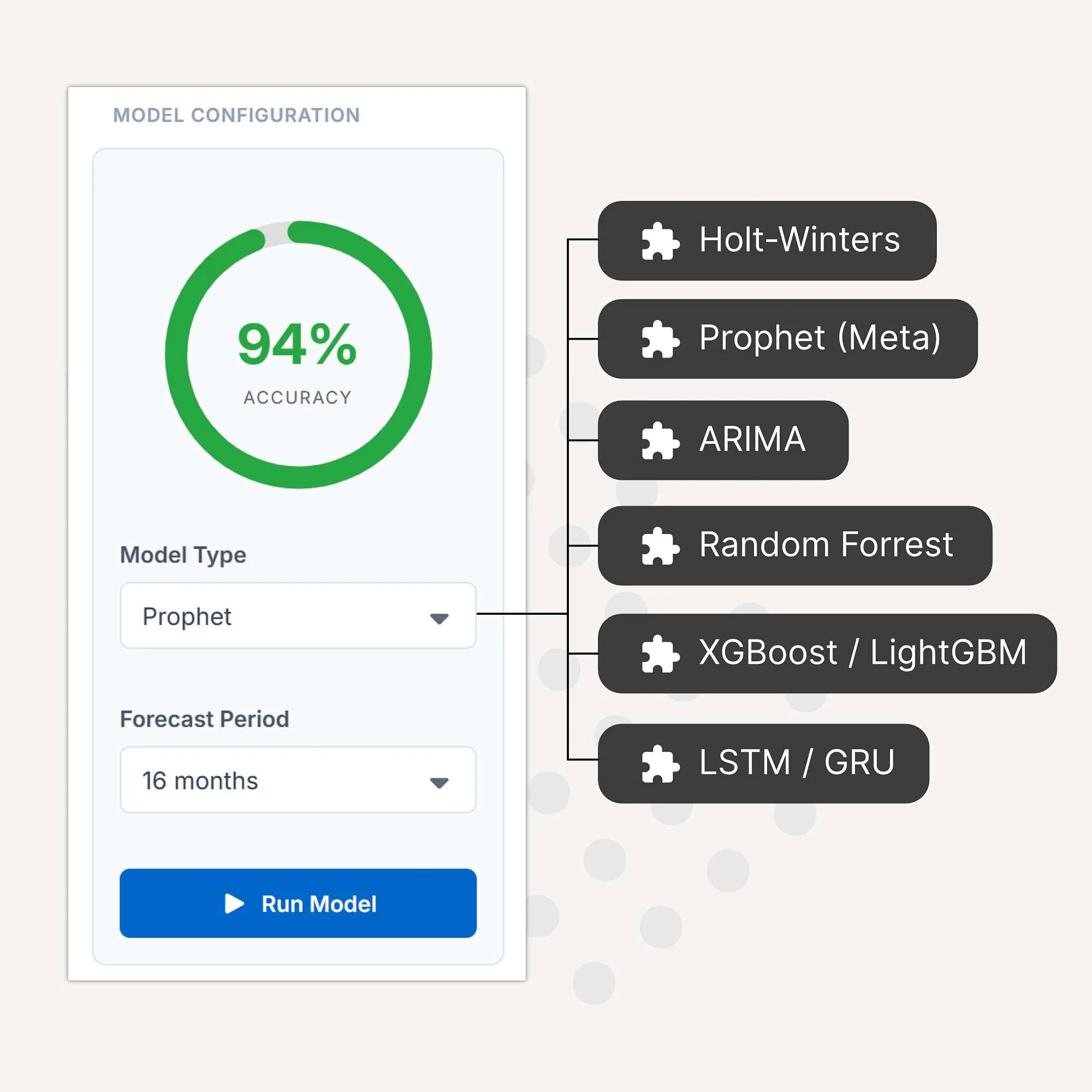 Powered by modern models, now accessible to everyone. No data science team required. Just choose the model that best suits your needs.